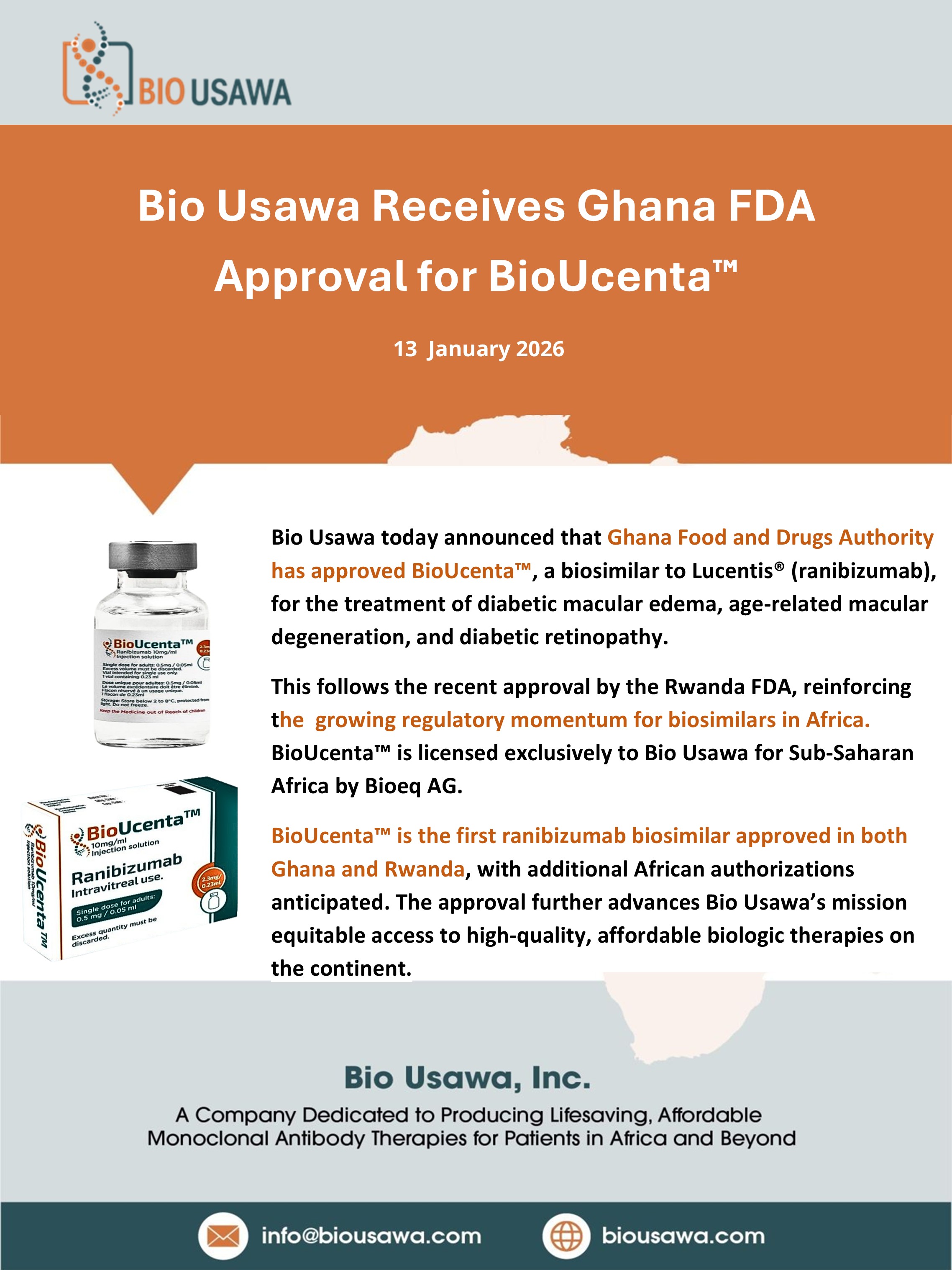 Accra, Ghana and Kigali, Rwanda — January 12, 2026 — Bio Usawa Biotechnology Ltd. (Bio Usawa, Inc.) today announced that the Ghana Food and Drugs Authority (Ghana FDA) has approved BioUcenta™, a biosimilar to Lucentis® (ranibizumab), for the treatment of diabetic macular edema, age-related macular degeneration, and diabetic retinopathy.