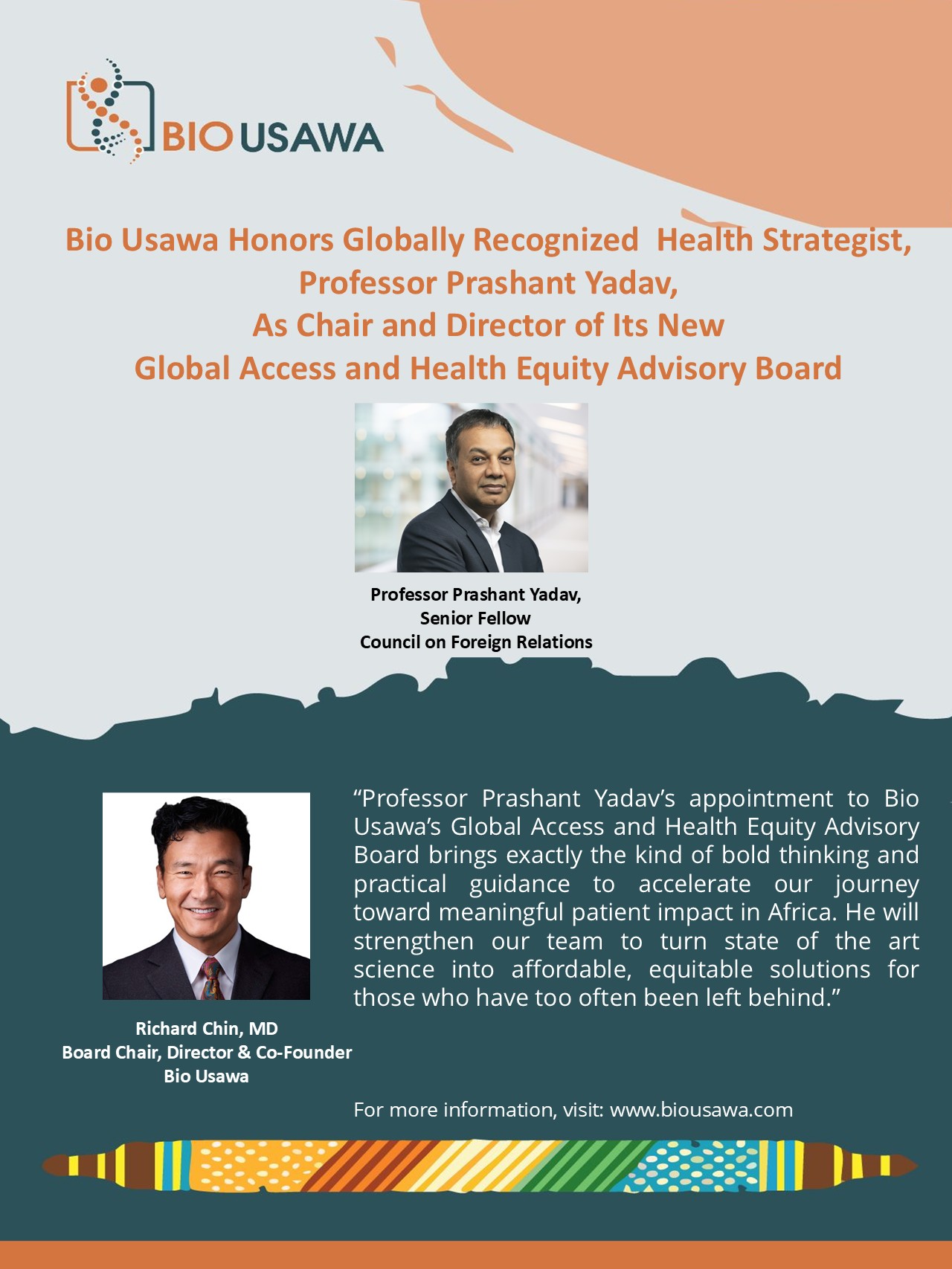 "Professor Prashant Yadav's appointment to Bio Usawa's Global Access and Health Equity Advisory Board brings exactly the kind of bold thinking and practical guidance to accelerate our journey toward meaningful patient impact in Africa. He will strengthen our team to turn state of the art science into affordable, equitable solutions for those who have too often been left behind." - Richard Chin, MD, Board Chair, Director & Co-Founder of Bio Usawa