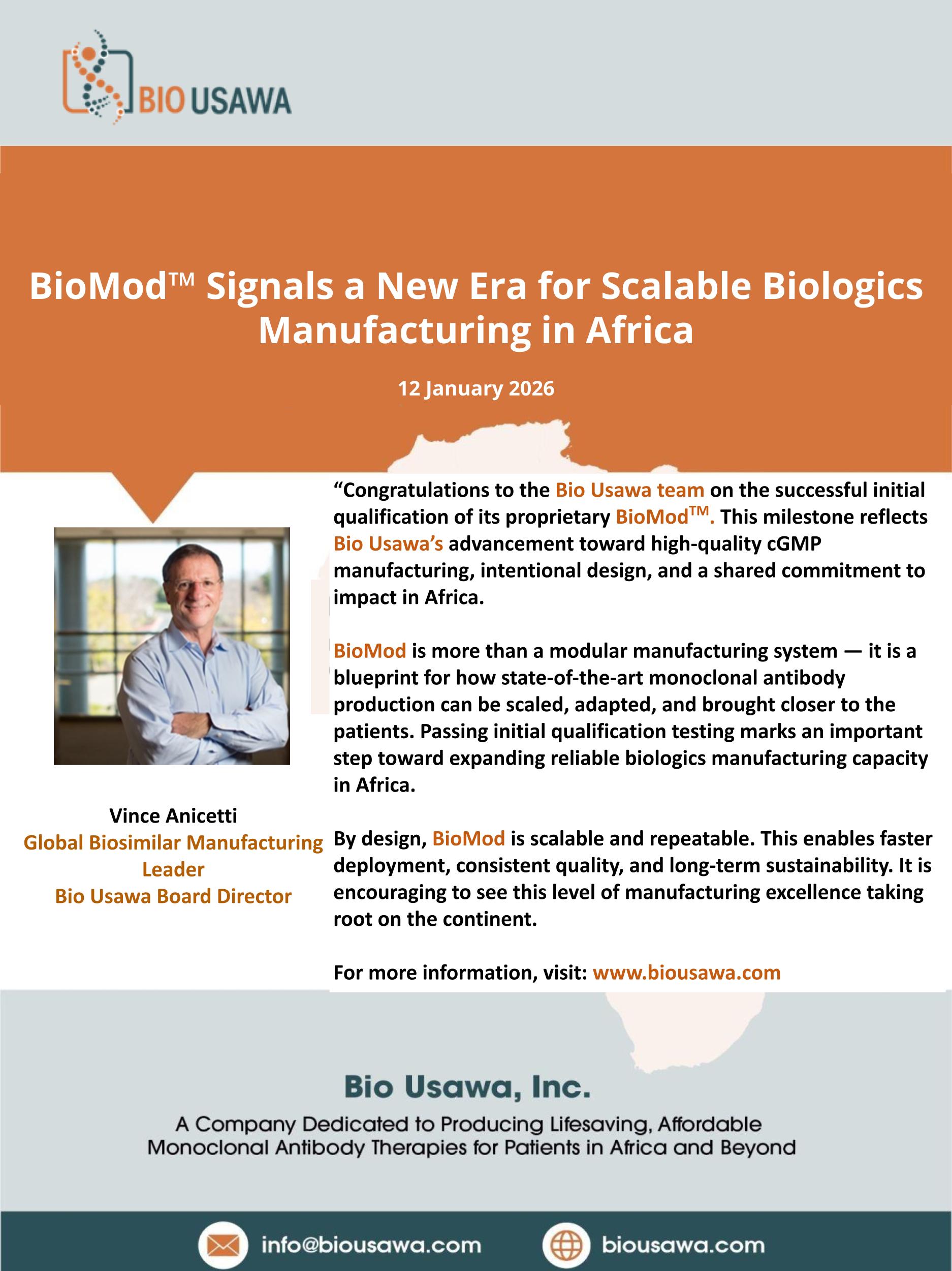 The successful initial qualification of Bio Usawa's proprietary modular biomanufacturing platform, BioMod™, marks a major step forward in building scalable, high-quality cGMP biologics manufacturing in Africa — designed for impact, sustainability, and patient access.