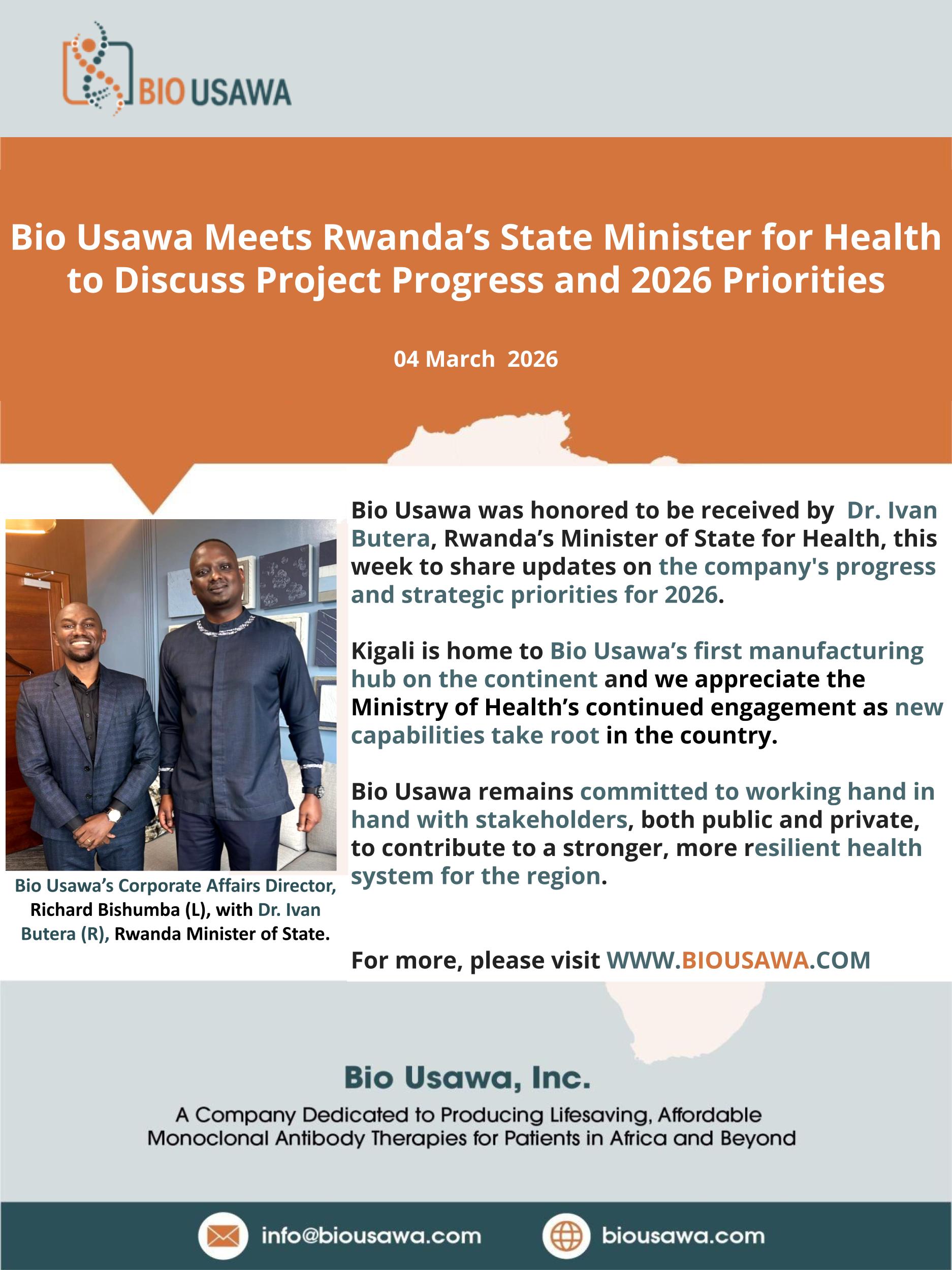 Bio Usawa was honored to be received by Dr. Ivan Butera, Rwanda’s Minister of State for Health, this week to share updates on the company's progress and strategic priorities for 2026.