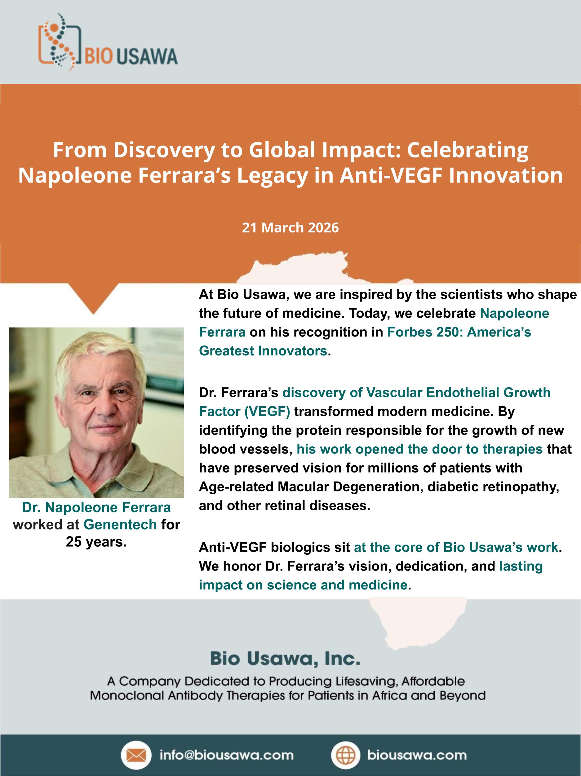 Anti-VEGF biologics sit at the core of Bio Usawa’s work. We honor Dr. Ferrara’s vision, dedication, and lasting impact on science and medicine.